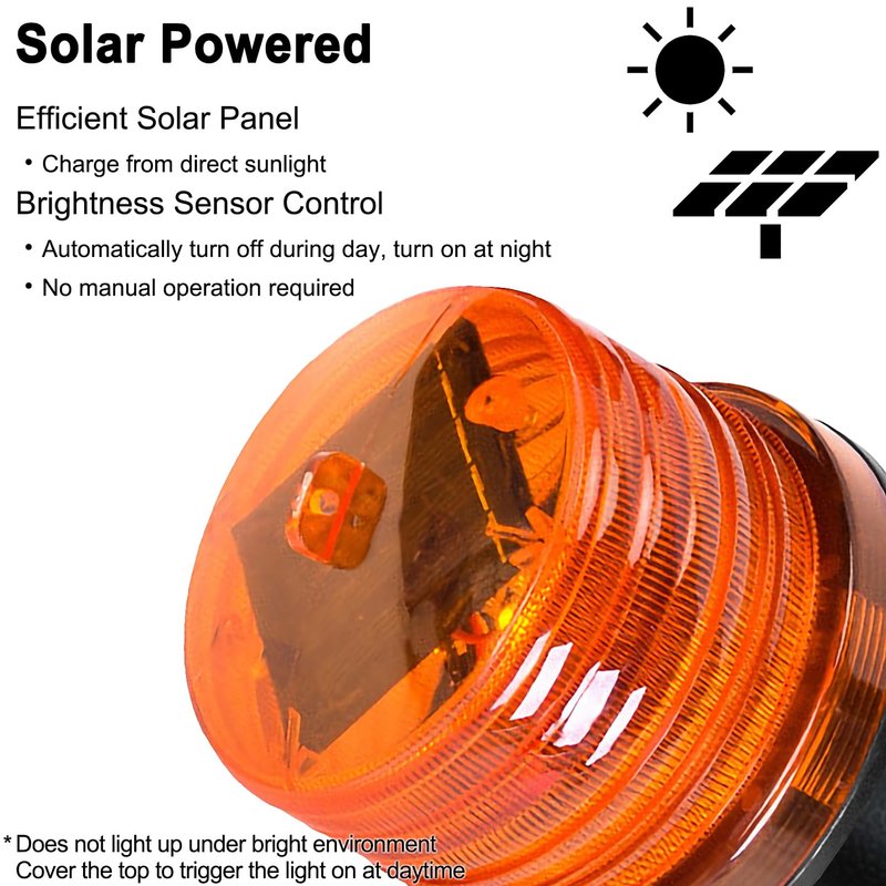 LED (red, yellow, blue, red and blue) visual distance of 500m, 360 ° self-luminous light body, the cover is good environmental PS modified plastic light transmission, the base is green PP plastic. Rainy days can work continuously for more than one week, super suction magnet can be attached to any iron above adaptation. Light control switch plus a manual switch. Contains a rechargeable battery + solar panel + super bright 48000MCD Solar PCB board + Grip Case.