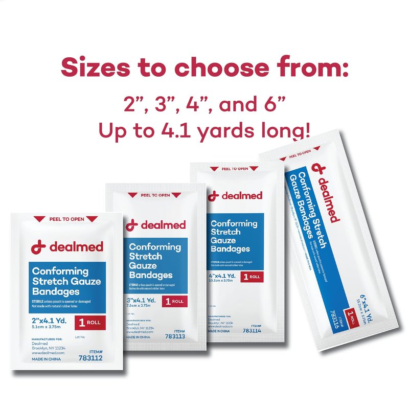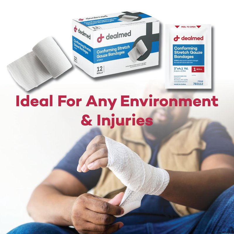 - Dealmed 2" Sterile Conforming Stretch Gauze Bandages, 4.1 Yards Latex Free Stretched Dressing Wrap, Medical Non-Adherent Wound Care Mesh Bandages (Box of 12 Individually Wrapped Rolls)