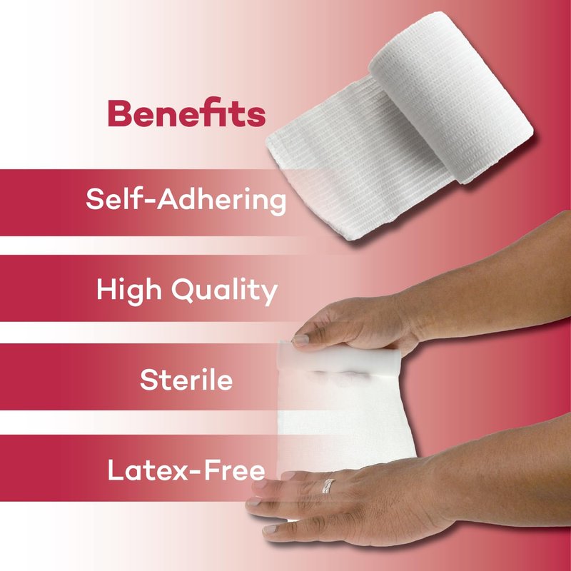 - Maximum Details: Each gauze roll is packed in a convenient and sturdy box for easy to access use. With strength and stretch, the bandages can be cut to size depending on injury or wound. The self-adhering, easy to use polyester gauze bandages require minimal taping. Their high quality, breathable fabric is latex free and designed for softness that helps eliminate allergic reactions., breathable fabric is latex free and designed for softness that helps eliminate allergic reactions.