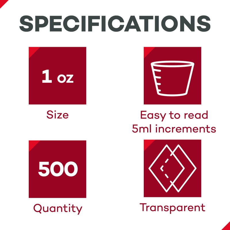 - Multiple Quantities: Each disposable medicine cup is 1 oz and comes packaged in a sleeve of 100 cups. Multiple quantity packs are available depending on the volume of usage, ranging from 100 cups up to 5000 cups.