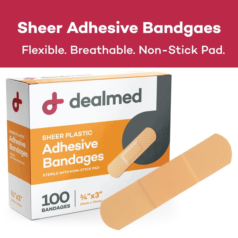 - Dealmed Sheer Plastic Flexible Adhesive Bandages – 100 Count (1 Pack) Bandages with Non-Stick Pad, Latex Free, Wound Care for First Aid Kit, 3" x 3/4"