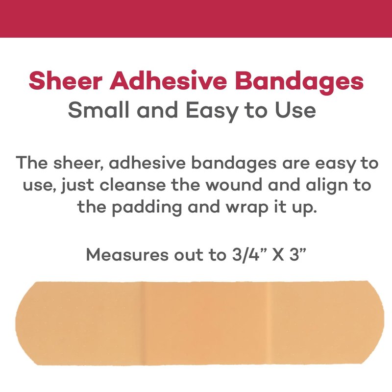- Sheer Adhesive Bandages, 3" x 3/4”: Our expertly designed sheer bandages create protection that is both flexible and breathable. These incredibly strong bandages will assure that no matter what you're doing, they will move with you to provide incredible coverage and protection.