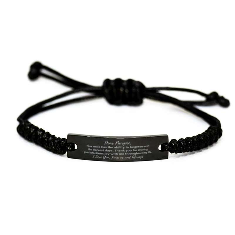 Make a bold statement with our meaningful Handmade Black Engraved Braided Rope Bracelet for Pawpee. This is a special gift for both men and women who can take it wherever they go. This handmade accessory is the perfect blend of style and simplicity, making it ideal for everyday wear. The thick, sturdy rope adds a touch of ruggedness to any outfit, while the sleek black color adds a touch of sophistication. The adjustable knot closure allows for a comfortable fit for any wrist size. Whether you're dressing up or down, our Black Rope Bracelet is a must-have accessory that will elevate your look instantly. This lovely message-engraved bracelet is perfect for husbands, wives, sons, or daughters. Durable and fashionable, it is the perfect fashion accessory. Order yours today and experience the perfect blend of fashion and function.