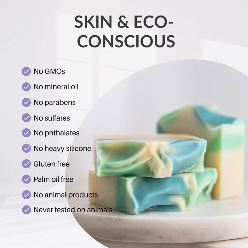 Eco-conscious: Our soaps are wrapped in a biodegradable shrink wrap and with 100% recycled paper label. Paper box package is recyclable. Please check with your local recycling provider on how/where to recycle the clear plastic box package.