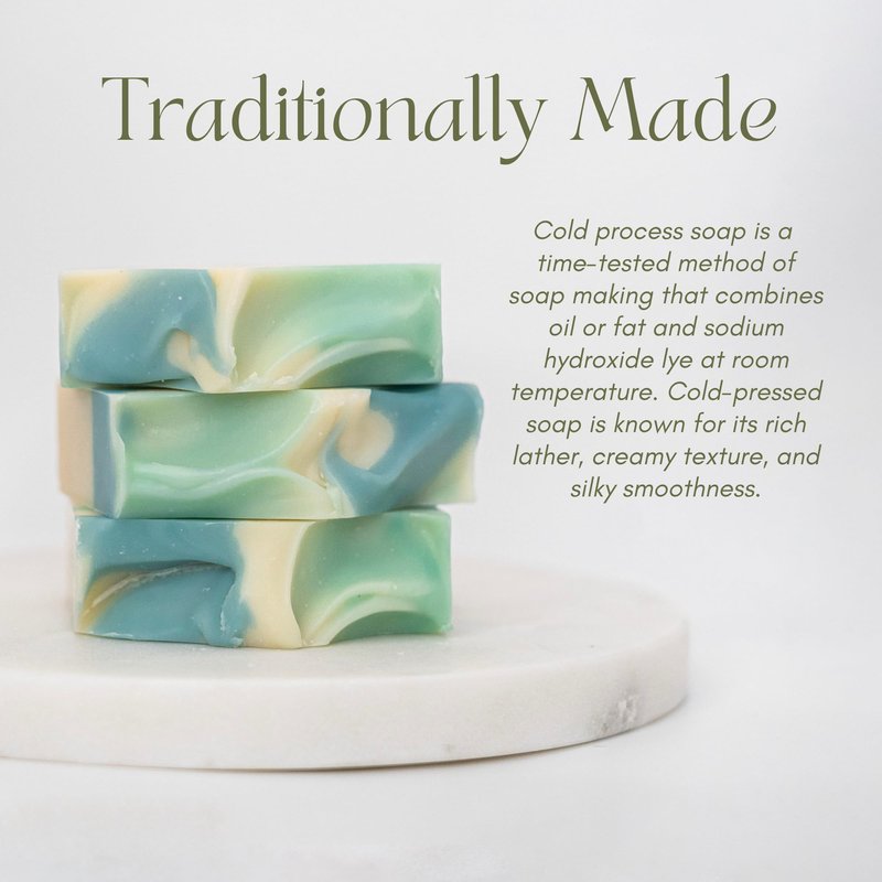 Traditionally made: Cold process soap is a time-tested method of soap making that combines oil or fat and sodium hydroxide lye at room temperature. Cold-pressed soap is known for its rich lather, creamy texture, and silky smoothness.