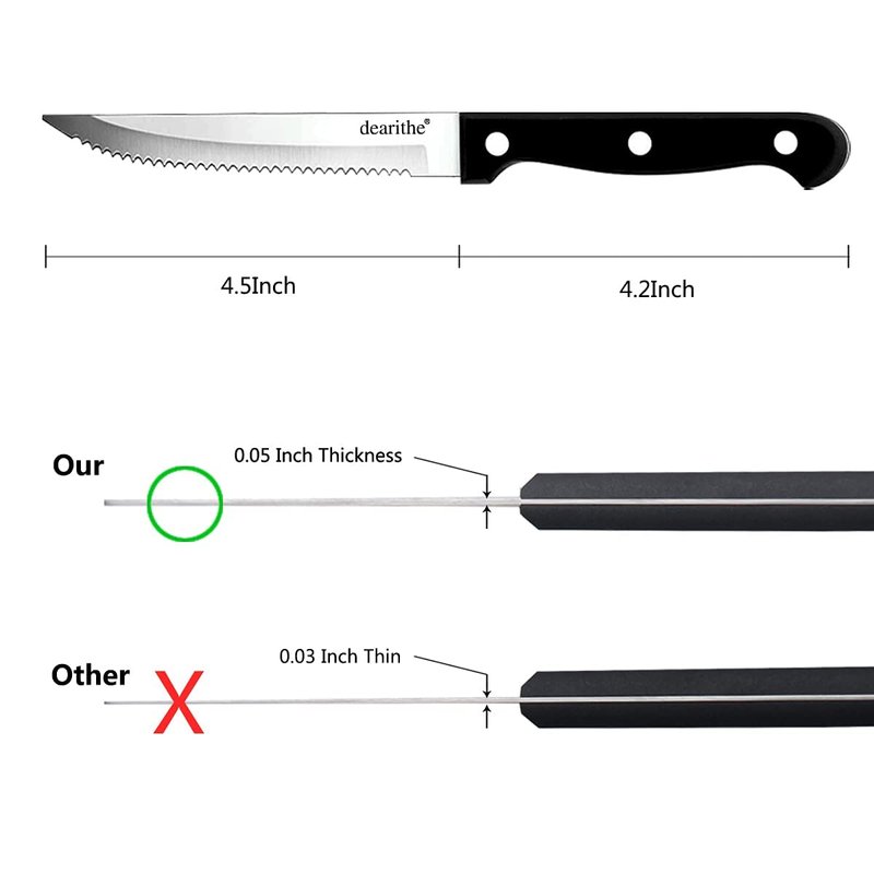 - Thickened Blade: Compared with the 0.03in thin of the same steak blade on the market, our blade is 0.05in thickness, which is not easy to break, safe and longer to use.