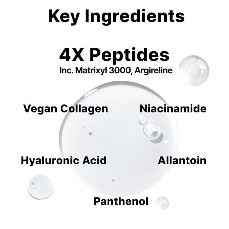 Cutting-edge peptides complex(Inc. Matrixyl 3000, Argireline) with Niacinamide, Hyaluronic Acid, Vegan Collagen, Panthenol, and Allantoin. This unique formula visibly reduces fine lines and wrinkles, promoting a more youthful skin. Say goodbye to wrinkles and hello to elastic, repaired skin with our collagen-boosting secret. Benefits 1. Stimulates Collagen Production: Peptides are known to help stimulate collagen production. Collagen is a protein that gives skin its thickness and suppleness. As we age, collagen breaks down, and the production decreases, leading to wrinkles and sagging skin. Peptides signal the skin to produce more collagen, helping to maintain a youthful and firm appearance 2. Reduces Wrinkles and Fine Lines: By stimulating collagen production and reinforcing the skin barrier, peptide serums can help reduce the appearance of fine lines and wrinkles. 3. Promotes Skin Elasticity and Firmness: Increased collagen production can also improve skin elasticity and firmness, making the skin look more toned and youthful. 4. Hydrates and Soothes the Skin: Peptides have properties that help to hydrate and soothe the skin, leading to a smoother and more even complexion. 5. Helps with Skin Repair and Regeneration: Certain peptides may also help with skin repair and regeneration.