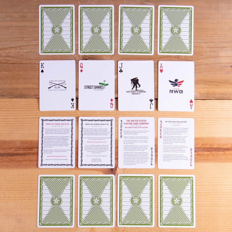 The post 9/11 Frontline Generation abounds with Frontline Leaders stepping up here at home. As a spin-off from 2003's Most Wanted Iraqi playing cards deck, let's flip the script and bring awareness to successful and impactful members of the military community, and highlight 52 post 9/11 businesses and charities. Each card represents a deeper narrative about the post 9/11 military communitys stories about grit, determination, passion, compassion, innovation, and leadership. Every branch of service is represented in this deck, along with family members, and Gold Star Families.​ Enlisted to officers, men and women from all walks of life, rising to opportunities and challenges, the front lines of our time. The cards are embedded with stories, connections to deployments and the home front, and, moreover, offer moments of pain, inspiration, and then purpose.