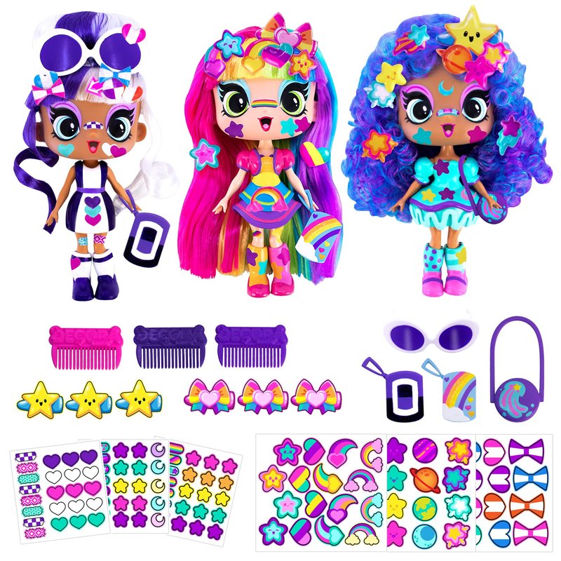 - COLORFUL AND PLAYABLE HAIR: Enjoy endless styling with soft, fully rooted nylon hair in fun hairstyles. Add puffy stickers to decorate and style this set of three fashion dolls, the Decora way.