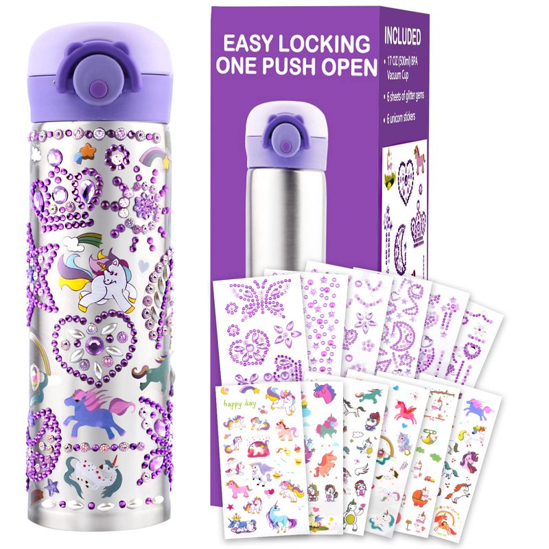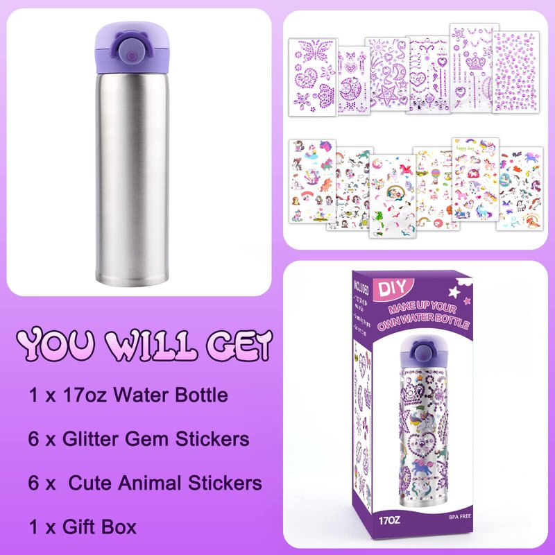 - 🎀【AMAZING PACK VALUE】🦄Decorate your own water bottle kits for girls! The package comes with a purple water bottle and 6 sheets of glitter gems and 6 sheets of cute stickers, more than enough for kids to decorate their water bottle. Your little girls can use the gemstone and stickers to decorate journals, laptops, or any smooth surface! Come let the kids use their unique imagination! Perfect birthday gifts for girls.
