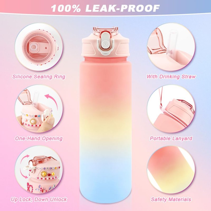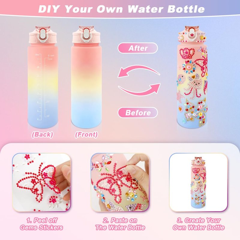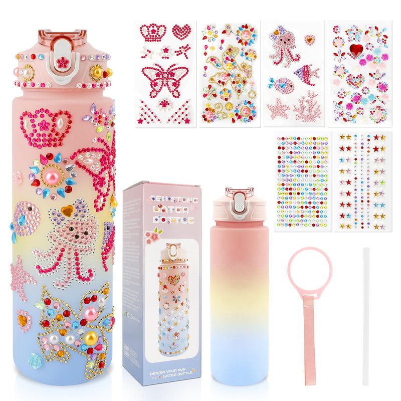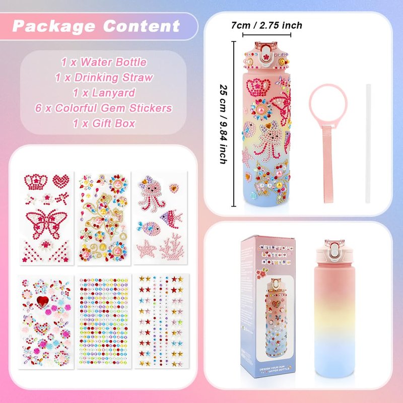 - Decorate Your Own Water Bottle Kits: Our DIY water bottle come in exquisite packaging, ideal birthday gift set for girls. This water bottle kits includes 750ml/25oz water bottle x1, gemstone sticker x6, Drinking Straw x1, Lanyard x1.There are not only enough colorful and glittery gems stickers for girls and boys to decorate their own water bottle, but also practical accessories make it convenient to use in daily lives.