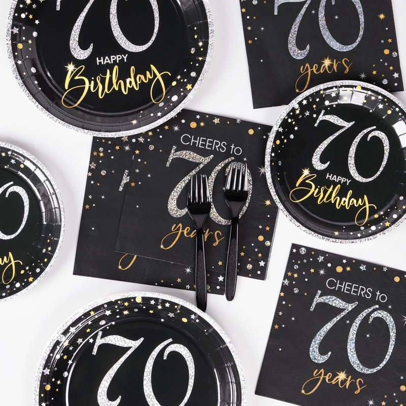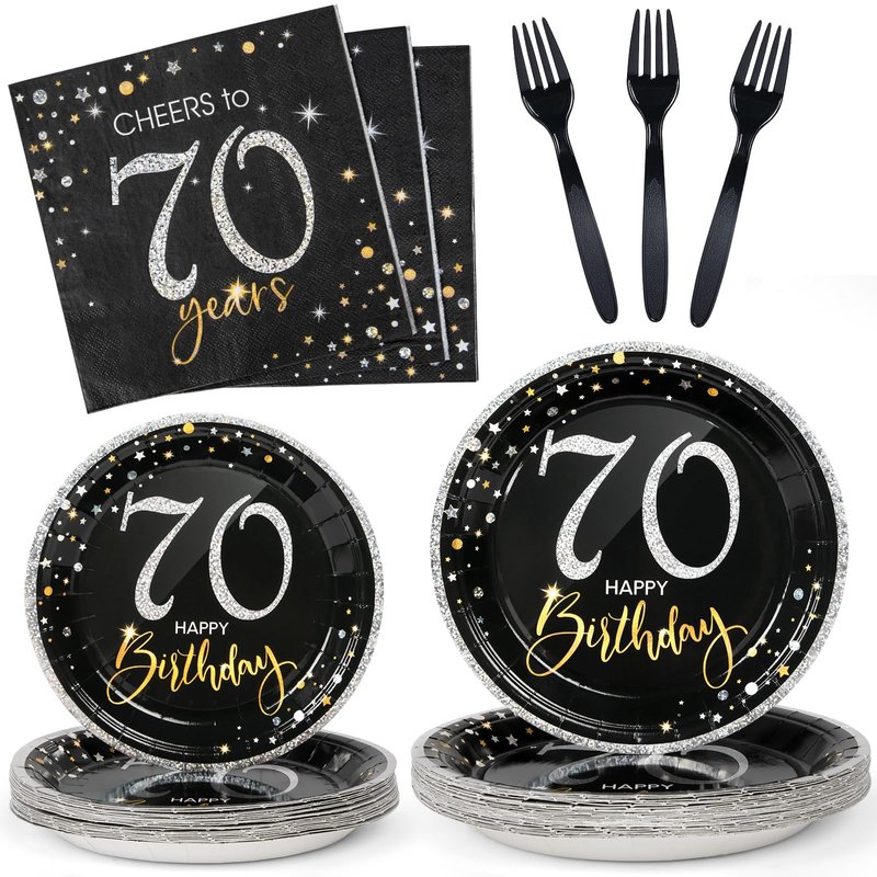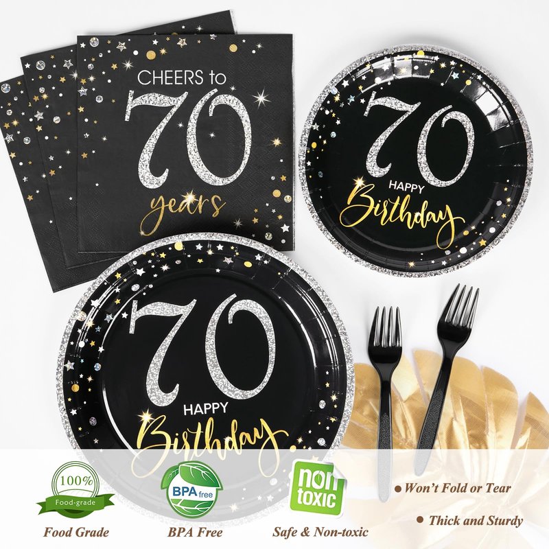 - 【Complete Party Set】 Simplify party planning with our comprehensive set designed for 24 guests, including 24 black and gold dinner plates (9''), 24 dessert plates (7''), 24 napkins (13''), and 24 forks (6.5''). Hosting your 70th birthday celebration has never been easier!