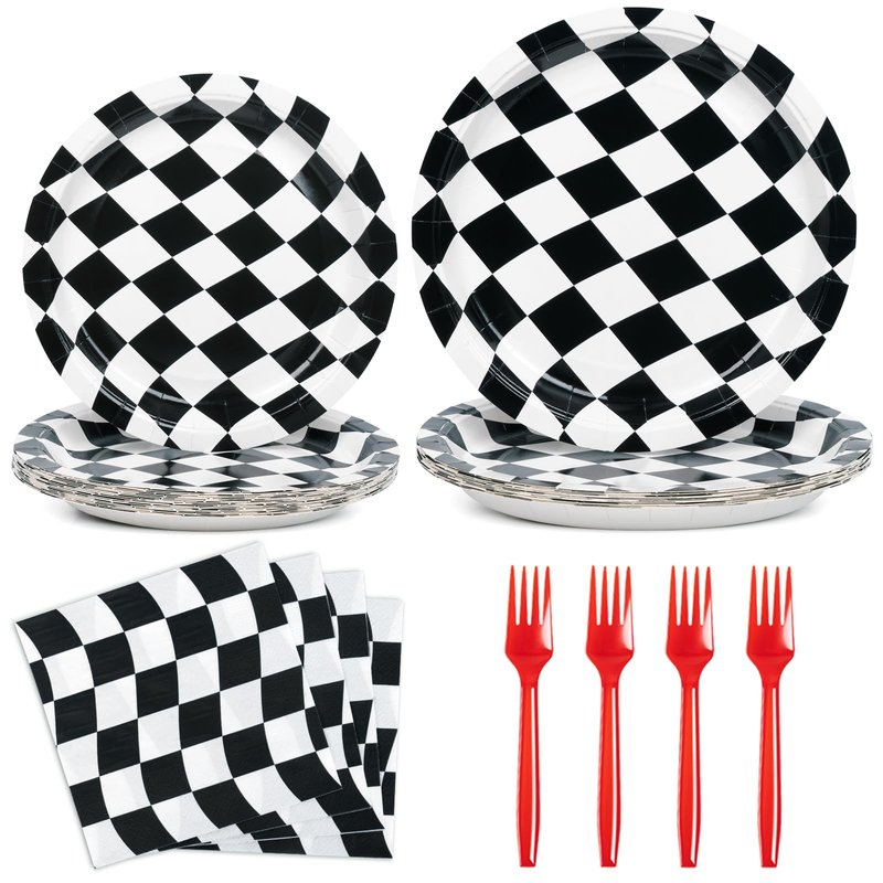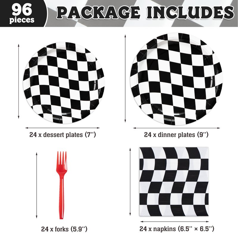DECORLIFE 96Pcs Checkered Flag Party Supplies, Black and White Checkered Plates and Napkins Sets Serve 24, Race Car Birthday Party Decorations for Boys Birthday