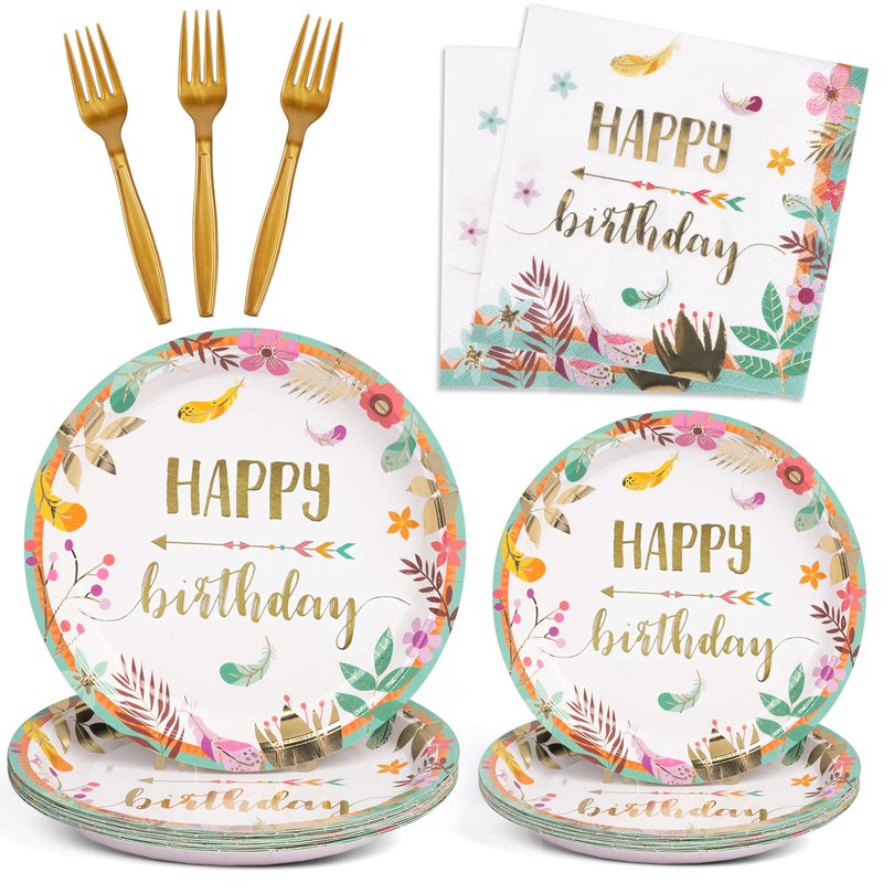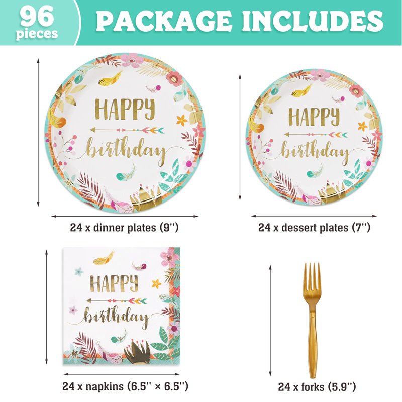 DECORLIFE Birthday Plates and Napkins Serves 24, Boho Birthday Party Supplies, Floral Plates, Forks Included for Women, Girls, Total 96 PCS