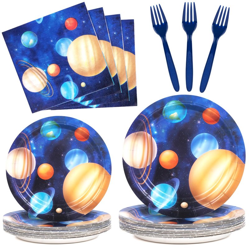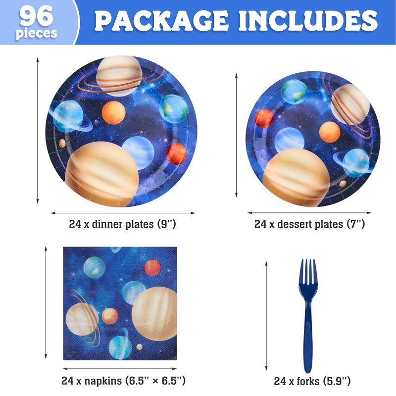DECORLIFE Space Themed Party Supplies Serve 24, Outer Space Party Decorations for Boys, Planet Plates Napkins Forks for Space Solar System Birthday, Total 96 PCS