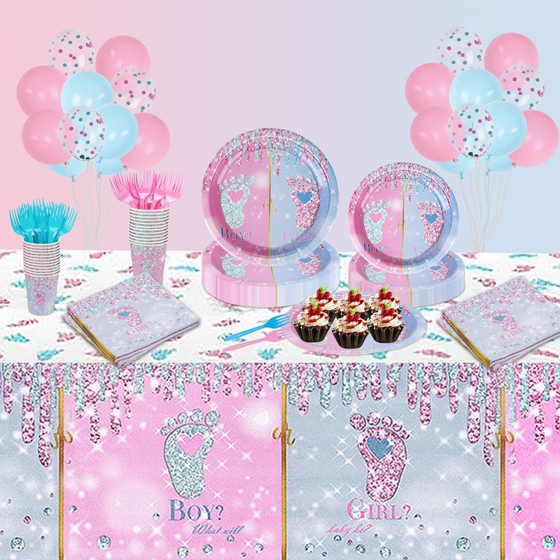 Designed with a sophisticated gender reveal theme, the set features delicate baby footprint designs and elegant text to create a warm and cheerful atmosphere. Enjoy a stress-free event with minimal cleanup, allowing you to spend more time enjoying the occasion with your loved ones.