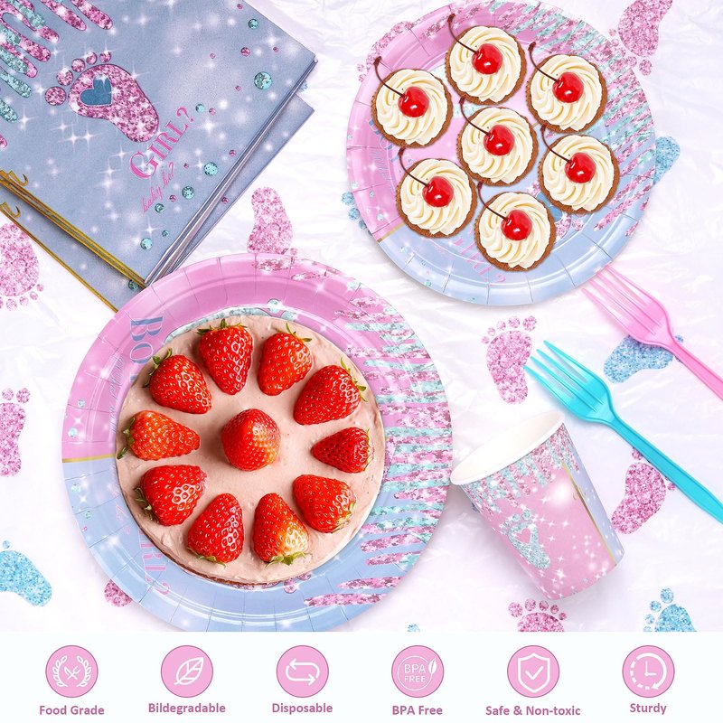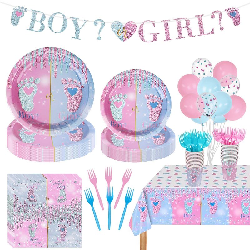 - Complete Gender Reveal Decorations Kit: Our comprehensive 146-piece gender reveal party decoration pack includes everything you need—24 dinner plates, 24 dessert plates, 24 plastic forks, 24 napkins, 24 cups, 1 tablecloth, and a charming “Boy or Girl”banner with coordinating balloons. Perfect for a chic and hassle-free baby reveal, this set guarantees a beautiful and coordinated celebration.