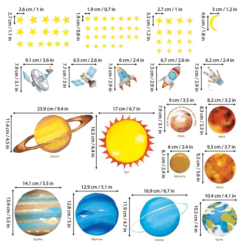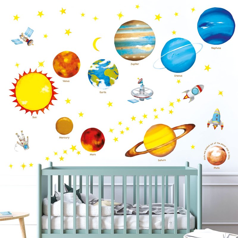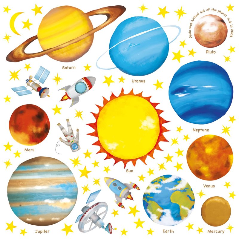 "Decorate your kid's room with this stunning multicolored educational set of Solar System Planet wall stickers"
