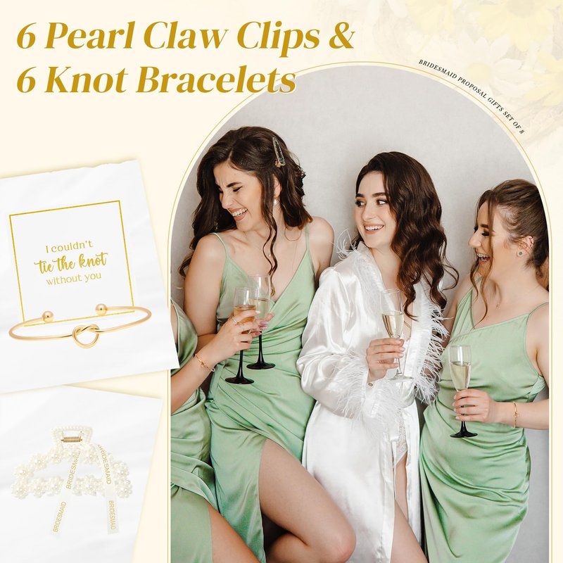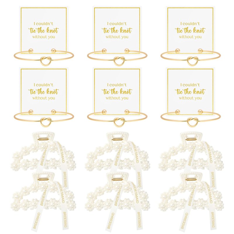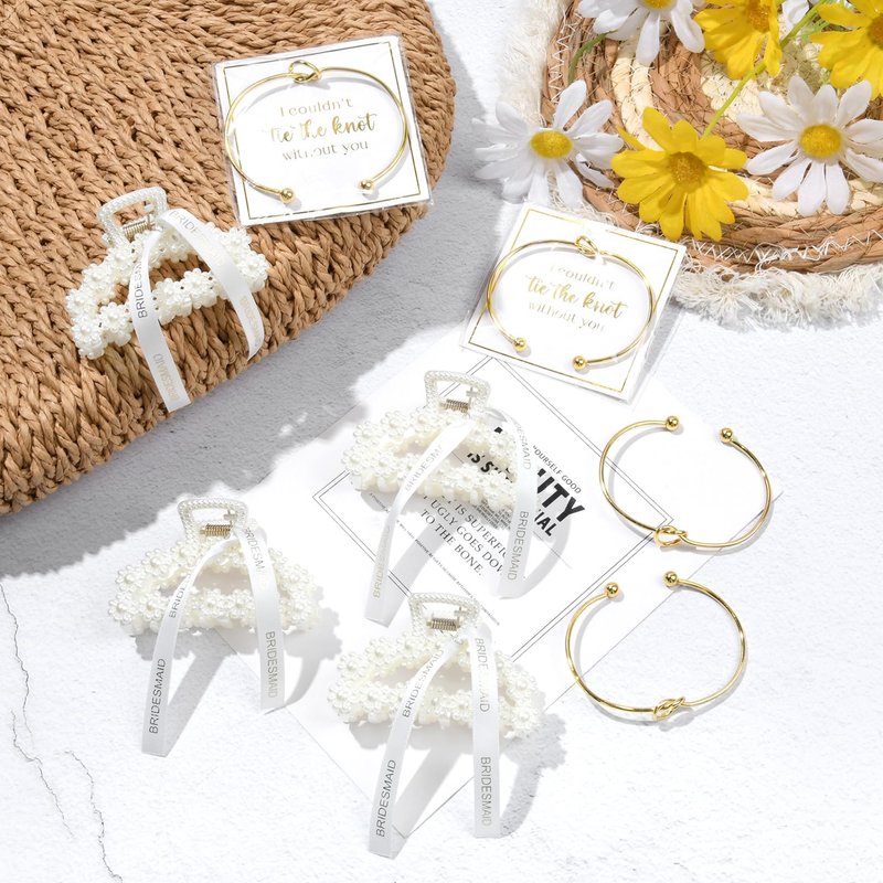 - 12 PCS Bridesmaid Gift - Each set includes 6 pearl hair clips and 6 knot bracelets. Each clip measuring 3 inches in length and 2 inches in width. Each clip is adorned with a delicate white ribbon with golden 'BRIDESMAID' lettering, adding a touch of elegance and charm