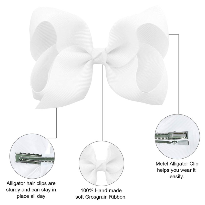 - SIZE:4 inch*2.8 inch; Alligator hair clips size: 2.2 inch; One bow weight: 0.3 ounce. Color of Solid White