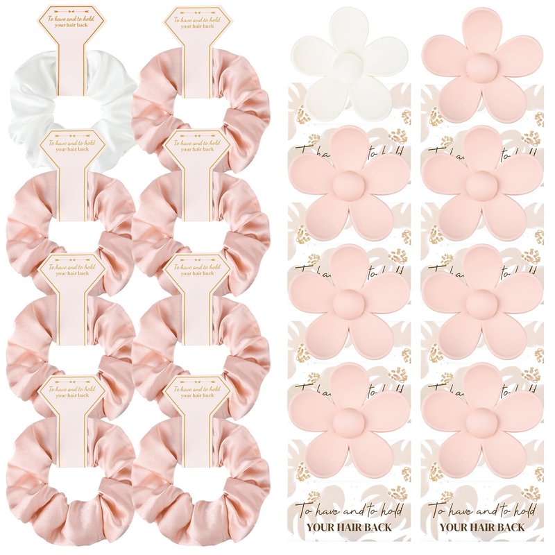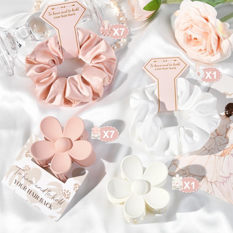- Bridesmaid Gift Set of 8- Each set includes 8 beautifully crafted flower-shaped clips and 8 satin hair scrunchies, measuring approximately 2.8 inches in length and width. These clips and scrunchies come packaged with adorable paper cards, each featuring a 'to have & to hold your hair back' design, adding an extra touch of elegance to your bridesmaid gift boxes.