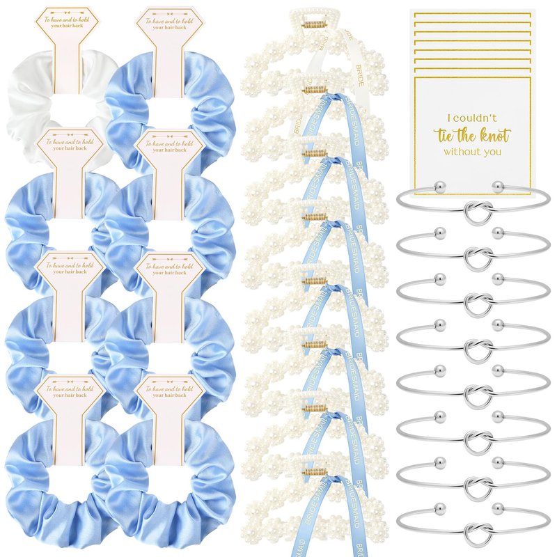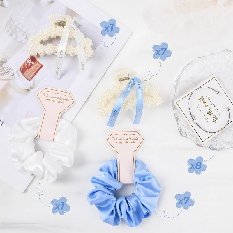 - 24 PCS Bridesmaid Gift - Each set includes 8 Tie the Knot Bracelet, 8 beautifully crafted pearl clips with ribbon, and 8 satin hair scrunchies. These clips and scrunchies come packaged with adorable paper cards, featuring a 'to have & to hold your hair back' or 'I couldn’t tie the knot without you' design, adding an extra touch of elegance to your bridesmaid gift boxes.