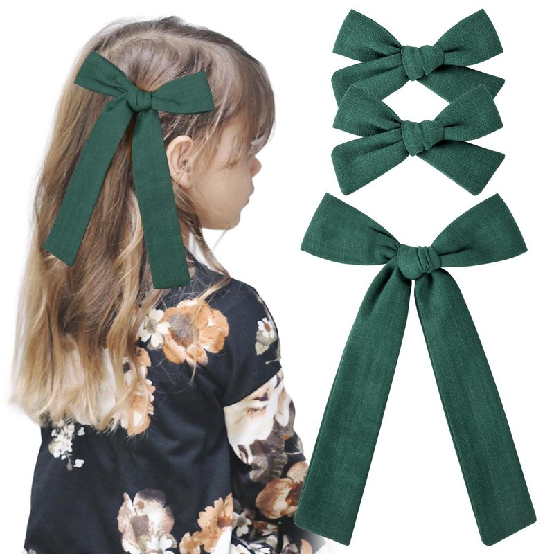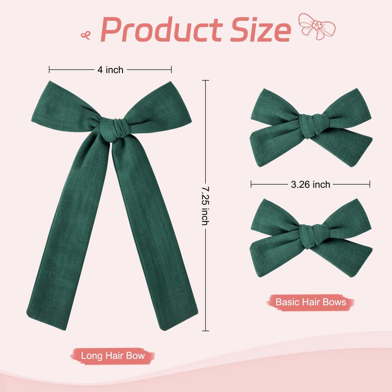 DEEKA Dark Green Cotton Linen Hair Bows 2 Sizes 5"&3.5" Soft Hair Bow set for Toddler Girls Long Ponytail Knot Bows Alligator Clip Hair Accessories for Little School Girls (Dark Green)