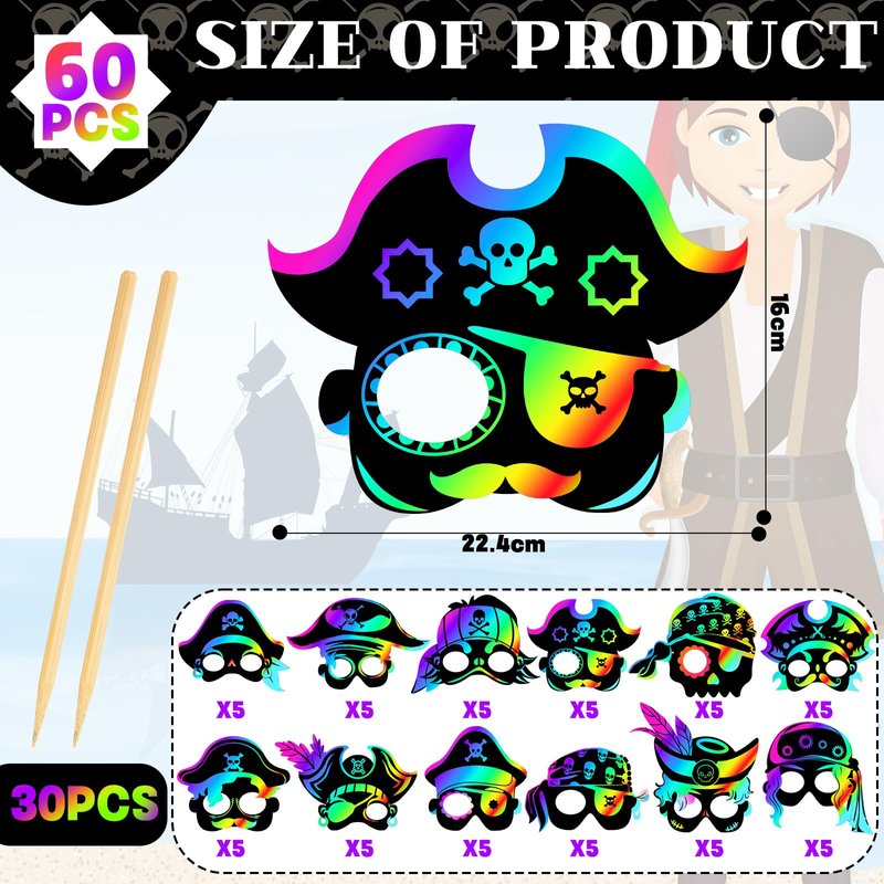 • Generous Quantity for Maximum Fun: our package includes 60 pirate scratch masks that are available in 12 styles with 5 masks of each style, 30 wooden sticks, and 60 elastic ropes; This sufficient quantity allows for multiple uses and can cater to a large gathering, ensuring no one misses out on the exciting art craft time; It's a nice fun activity for parties or family gatherings