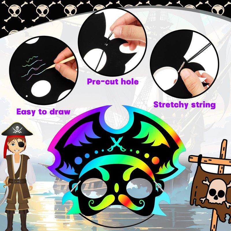 • Easy and Fun to Use: our scratch masks are very easy to use; First, prepare all the accessories beforehand; Then use a wooden stick to draw your own pattern on the art masks; All our pirate scratch crafts have precut holes that can be easily passed through with the included elastic ropes