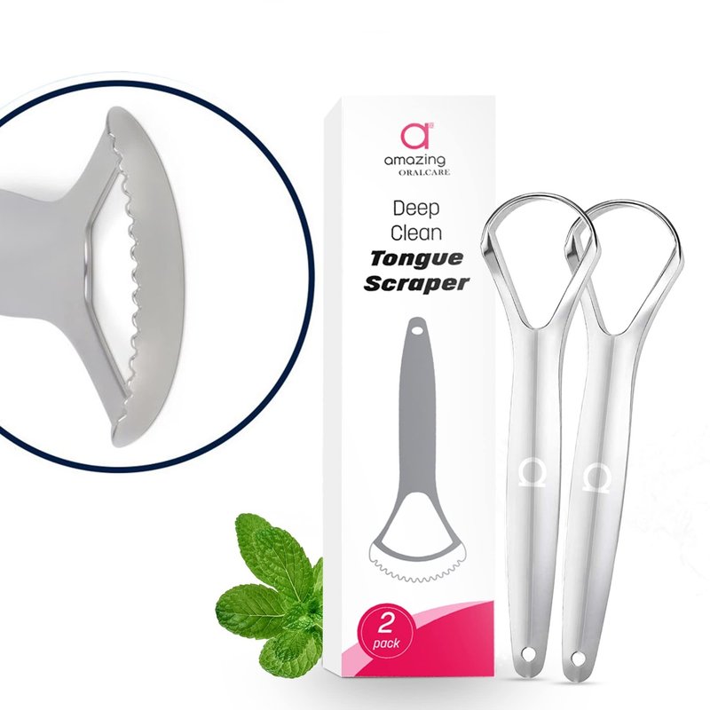Deep Clean Tongue Scraper- Double-Ended - Flat + Serrated Edge Design, (2pk) Stainless Steel, by Amazing Oralcare