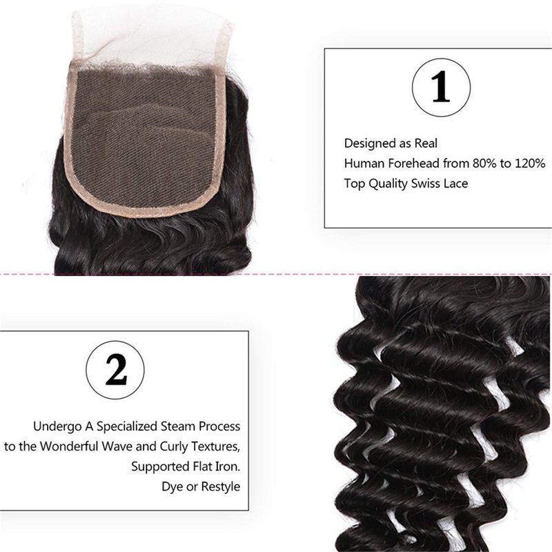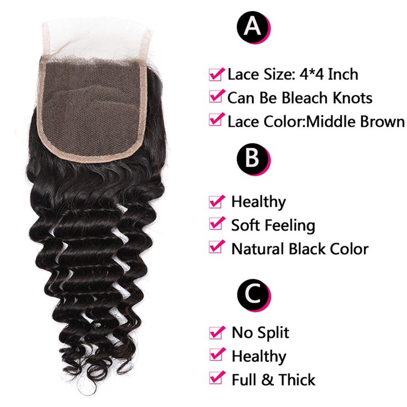 Deep Wave Closure Size 4"x4" 150% Unprocessed Brazilian Virgin Human Hair Bleached Knots Free Part Top Front Lace Closure Naturl Black Soft and Smooth (Brazilian NS-18inch 4x4)