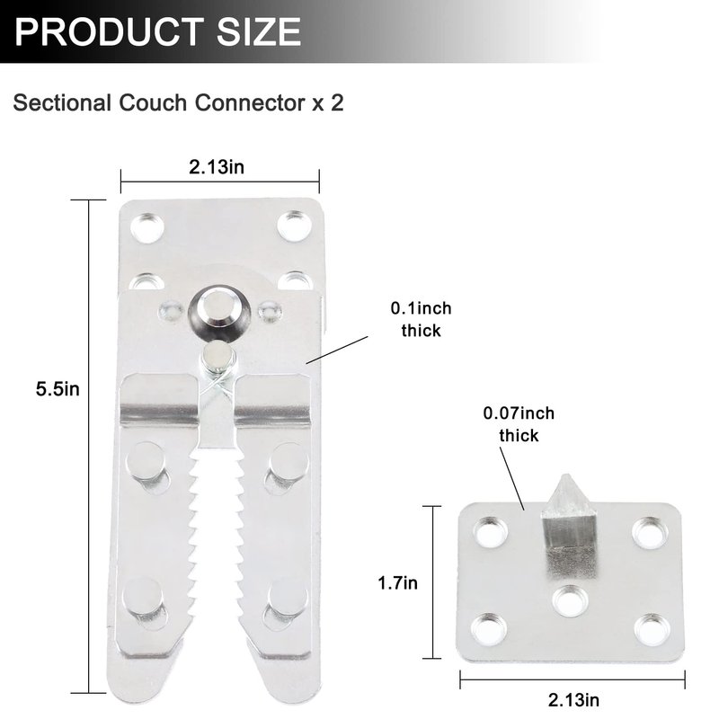 - Size--Size of couch clamp--5.5" × 2.13". Screw size -1.2". Color - sliver. Package includes - 2 piece sectional connectors.