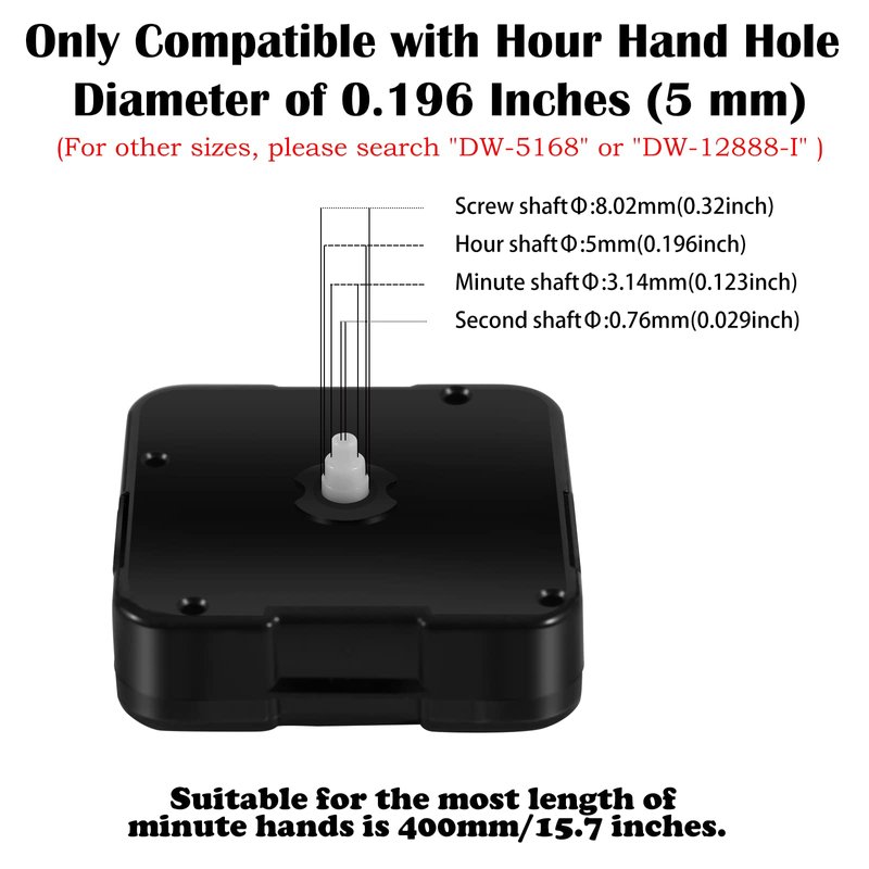 - SUPPORT CLOCK HANDS HOLE SIZE - This DW-12888 series could support hour hands hole diameter is 5mm(0.196 inches), minuted hands hole diameter is 3.14mm(0.123 inches), and Second hands hole diameter is 0.76mm(0.03 inches). (Could support minuted hands most length is 400mm/15.7 inches). Please measure your old hands' hole diameter before buying.