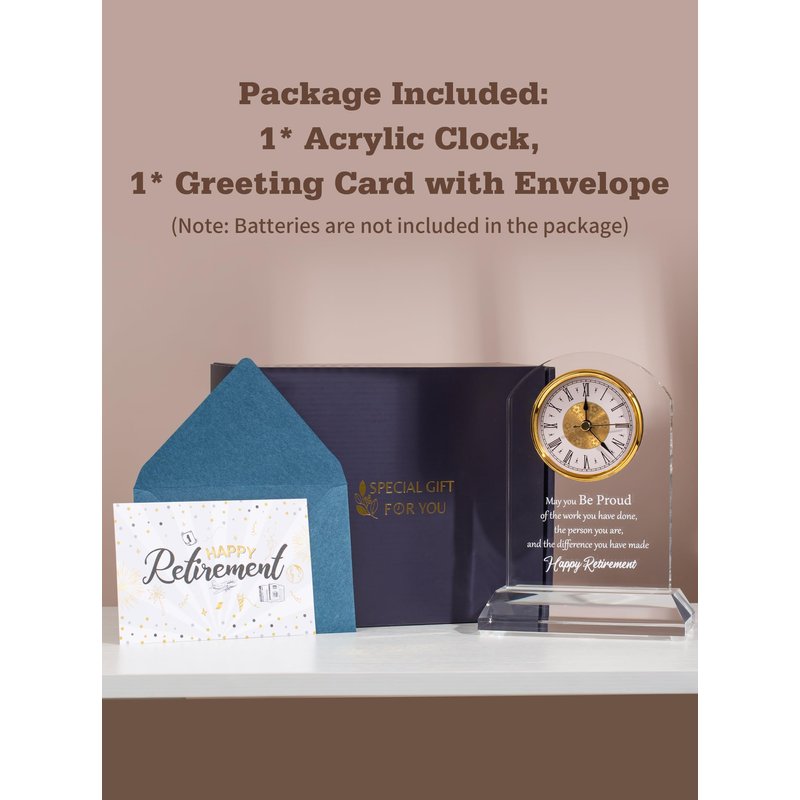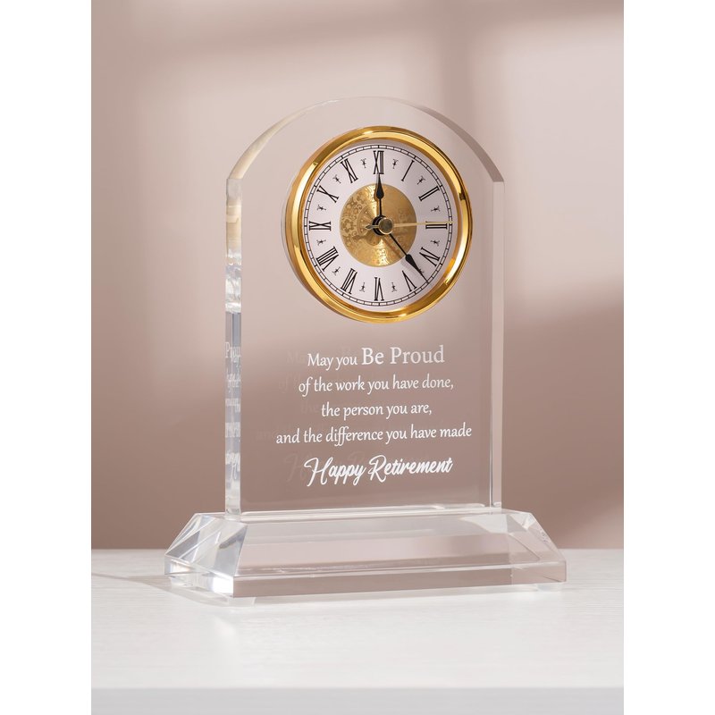 - CELEBRATE A REMARKABLE JOURNEY: Our exquisite retirement clock is more than just a timepiece; it's a celebration of a remarkable journey. Crafted with premium acrylic and adorned with a clear UV-printed message, "May you Be Proud of the work you have done, the person you are, and the difference you have made Happy Retirement," it serves as the perfect gift to honor and commemorate a well-deserved retirement.