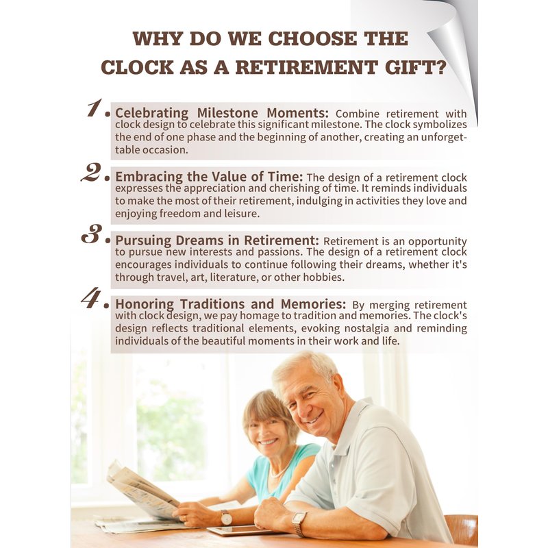 - A TESTAMENT TO PERSONAL ACHIEVEMENTS: Our retirement clock is not just a time device; it's a tribute to personal achievements. It serves as a proud memento, reminding recipients to remember their past accomplishments and appreciate the journey that shaped them into the unique individuals they are today. It is a constant reminder of their value and contributions to society, making it a cherished gift that inspires joy and happiness in their retirement years.