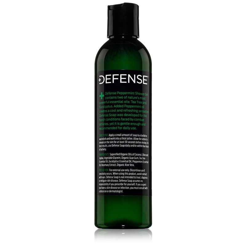 Defense Soap provides Full Strength Natural Essential Oils PROVIDES A BROAD SPECTRUM OF BENEFITS DERIVED FROM TEA TREE OIL, PEPPERMINT OIL AND EUCALYPTUS OILPROVEN IN THE WORLD OF CONTACT SPORTS EFFICIENTLY REMOVES dirt, grime, gym crud, sweat, smog, allergens, grunge, and built up oils HIGH DENSITY LATHER for deep cleansing pores SUPERIOR RINSING action RESTORES THE SKIN'S natural barrier and helps controls the production of sebum and dead skin cells PERFECT FOR ACTIVE LIFESTYLES supports proper hygiene routines. Recommended after workouts. NATURAL DEODORIZING INGREDIENTS helps wash away odorHYPOALLERGENIC AND SAFE for sensitive skin NATURAL, FREE & CLEAR. NO FRAGRANCES, DYES, COSMETICS, PETROCHEMICAL COMPOUNDS, TRICLOSAN, ALCOHOL OR SODIUM LAURYL SULFATE. MADE in the USA