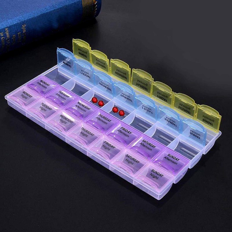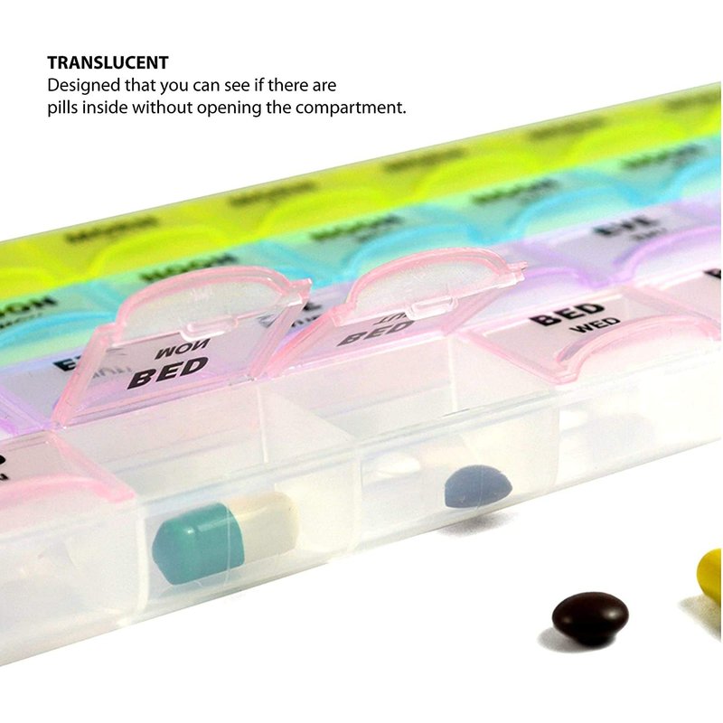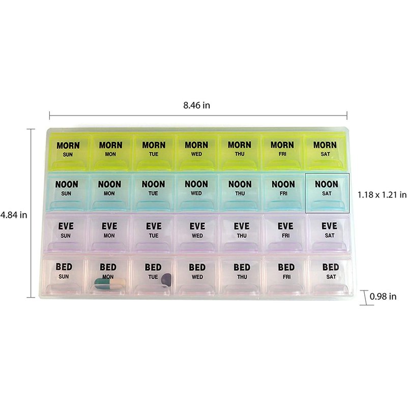 Convenient and easy to use Push button lids This weekly pill reminder comes with push button lids that indicate the day of the week with letter. Its lids are translucent, so you'll know if you have taken your medicine without opening the lid. This weekly pill reminder comes with snap lids that indicate the day of the week with letters. Its lids are translucent, so you'll know if you have taken your medicine without opening the lid. Our pill box is made of rugged and durable plastic to last for a lifetime. push button lids 4 times a day beautiful multi-colors separate snap lids PERFECT MEDICINE ORGANIZER With this pill organizer you don't need to worry about tracking your consumption. This simple & stylish pill box organizes yor medication 7 days in advance! Due to the different typesetting production batches, the colors and patterns will be different, please make sure that you do not mind before bidding, the products are shipped randomly. PEACE OF MIND You will be able to just pop this vitamin organizer in your purse, suitcase, briefcase or travel bag. Each individual lid locks securely tight so you will not be worried of the contents falling out or getting lost. Design It consists of 28 large compartments with separate snap lids for every compartment. The lids are designed translucent so that you can check your regularity without even opening them. Each lid has the first letter of a week-day with am and pm label. Attractive, Odorless and Long Lasting What makes this pillbox organizer unique is that it comes in beautiful multi-colors. Itâs made of tough and durable plastic, and is strong enough to last throughout the long run. You must have noticed that most plastic boxes release some pungent odor, but our pill organizer is odorless and safe. Perfect week-planner The organizer allows you to plan your seven day medication for foutrtimes a day. It helps you make sure that you haven't missed any dose.