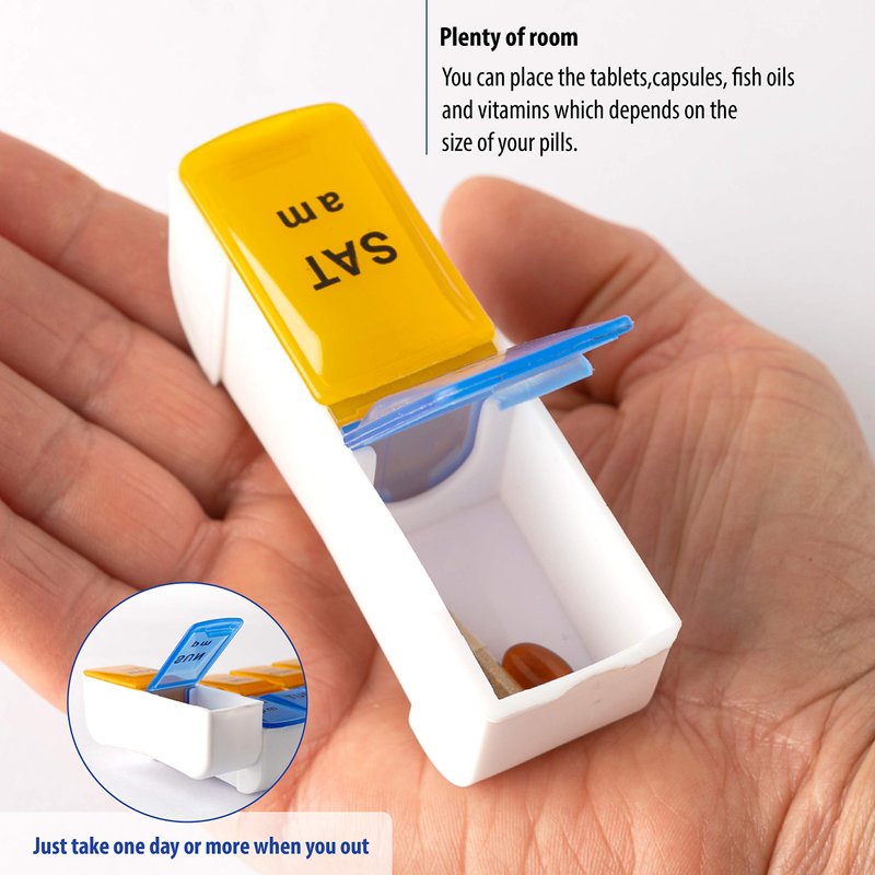 - Fourteen Days or Seven Days. It consists of seven large individual detachable compartments with separate snap lids. The lids are designed translucent so that you can check your regularity without even opening them. Each lid has the first letter of a week-day with am and pm label.