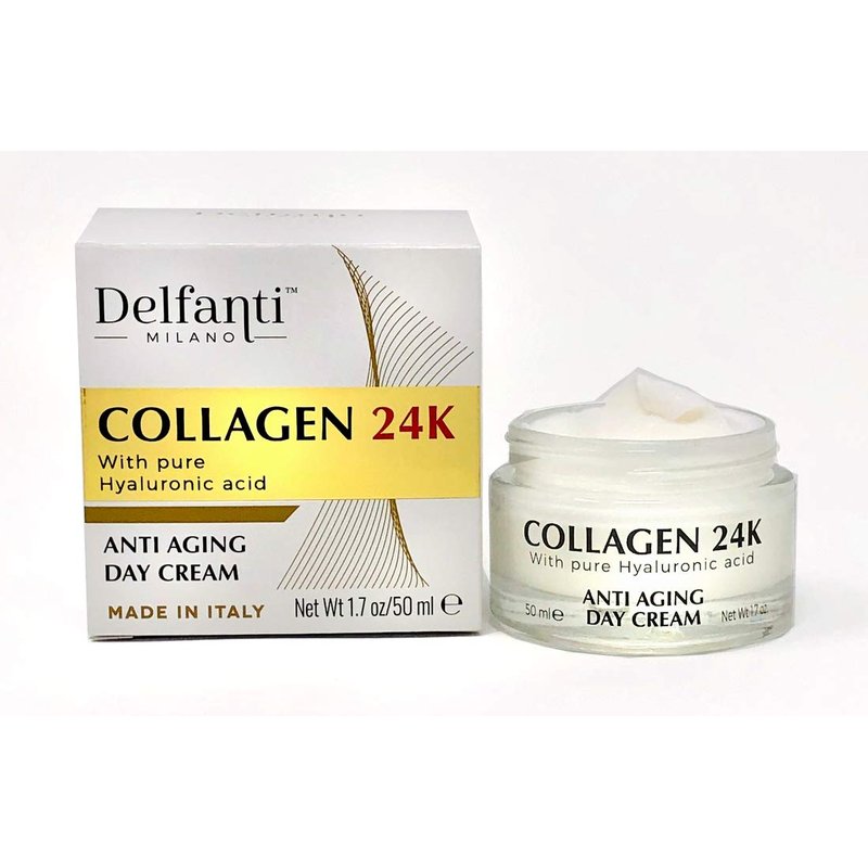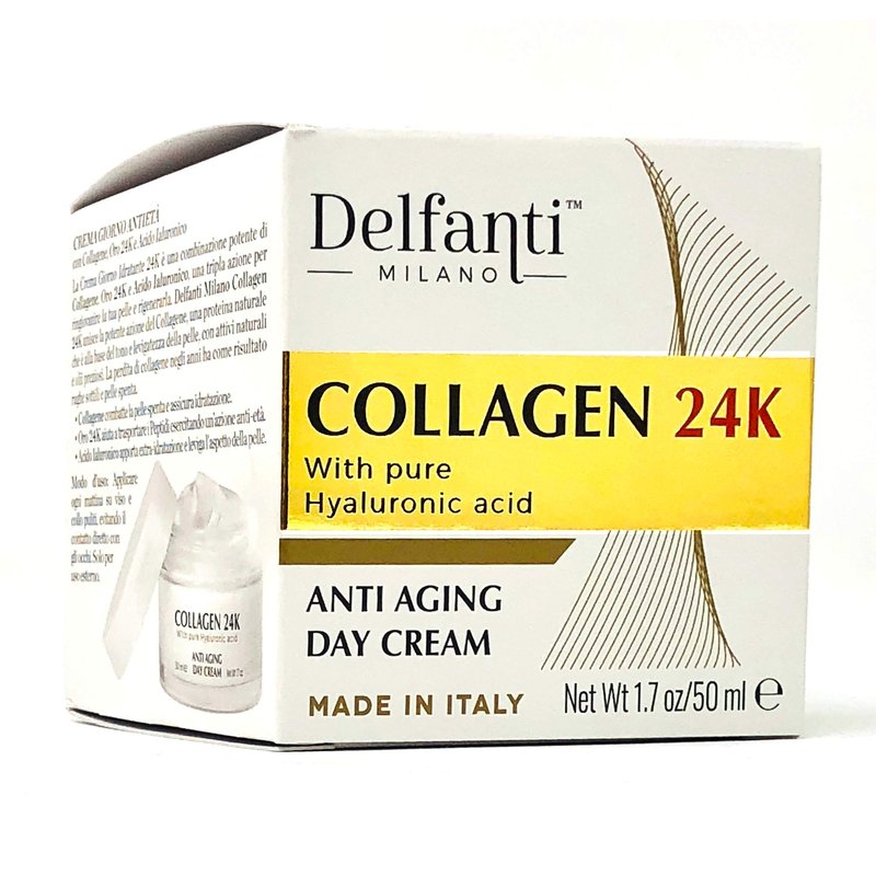 PURE COLLAGEN 24K Anti-aging Day Cream is a powerful combination of Collagen, Pure 24 K Gold and Hyaluronic Acid - a triple ingredient complex to achieve a radiant appearance. Delfanti Milano COLLAGEN 24K boosts the powerful actions of Collagen, a natural protein that is the base of skin's tone and smoothness, with natural actives and precious oils. The loss of collagen over the years results in fine lines, wrinkles and sagging skin. TO USE: Apply every morning to a cleansed face and neck, avoiding direct eye contact.