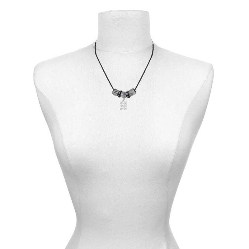 - Decorative pendant beads include black enamel with clear crystal rondelles and antiqued silvertone beaded pendant drops.