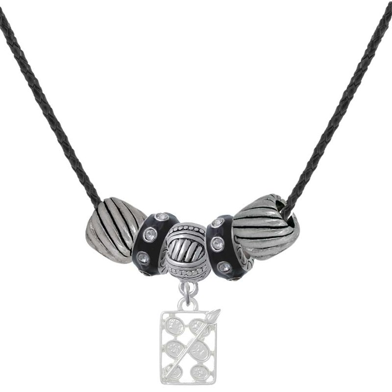 Silvertone 3-D Eye shadow Makeup Palette Black Beaded Necklace. Charm size is approx. 0.7 x 0.48 x 0.12 inches (HxWxD) including loop. Black braided cord is 18 inches long with a 2 inch extender chain. Lobster Claw Clasp. Decorative pendant beads include black enamel with clear crystal rondelles and antiqued silvertone beaded pendant drops. PLEASE NOTE: Our products are not intended for children 14 years and younger.