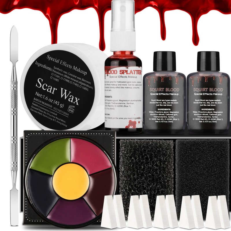 - 【KIT CONTAINS】-Modeling Scar Wax(1.6 oz), Trauma Makeup Creme Wheel(6 colors), Blood Splatter(1.3 fl oz), Squirt Blood, Fresh(0.5 fl oz), Squirt Blood, Dark(0.5 fl oz), 2 Types of Stipple Sponges, 10 Makeup Sponges, 1 Spatula Tool.