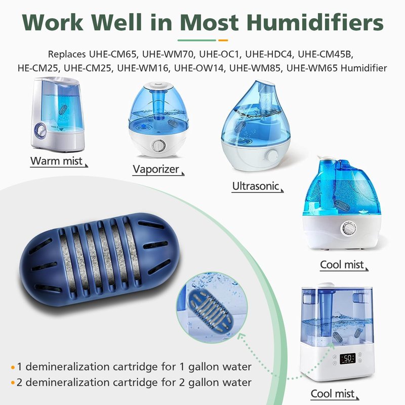 - FITS HUMIDIFIERS: These filters compatiable with Homedics UHE-CM65, UHE-WM70, UHE-OC1, UHE-CM45B, UHE-CM25, UHE-WM16, UHE-OW14, UHE-WM85. Compatible with all HoMedics 1-gallon or larger ultrasonic humidifiers. Compare to demineralization cartridge UHE-HDC4. Fit evaporative, Warm & Cool Mist Ultrasonic Humidifier, most humidifier, such as Vicks, LEVOIT, Honeywell, Homasy.