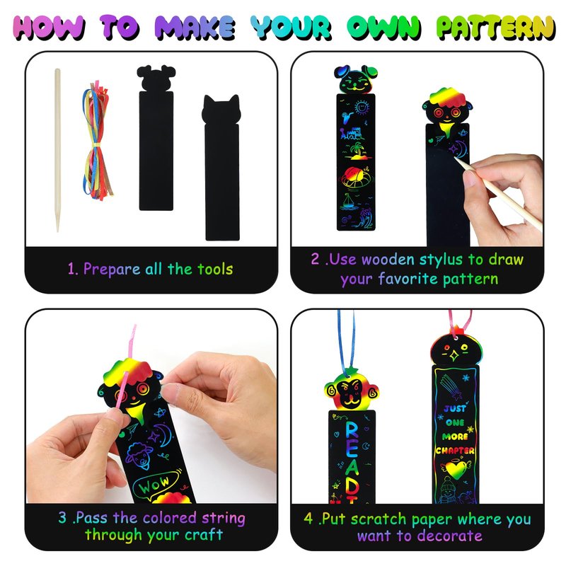 - 【Scratch Bookmarks Material】 - Art craft paper bookmark are made of thick paper cardboard which is non-toxic and no odd flavor. And wooden stylus is made of natural logs and polished smooth all over for safe use. The ribbons are made of high quality silk, easy to use and can be hung anywhere!