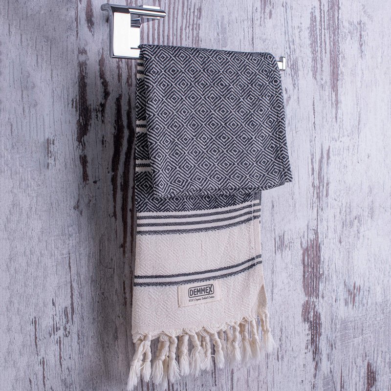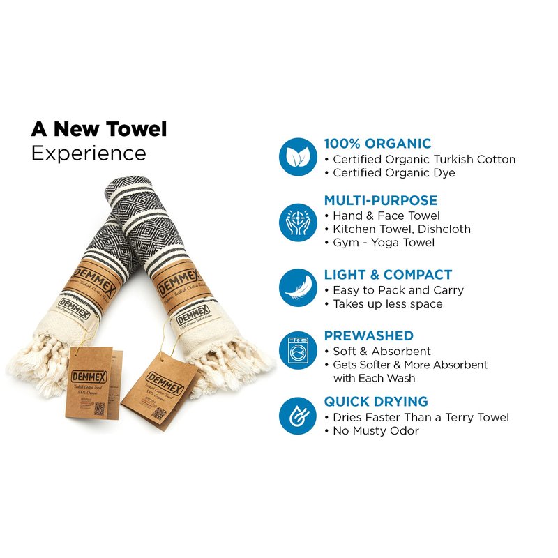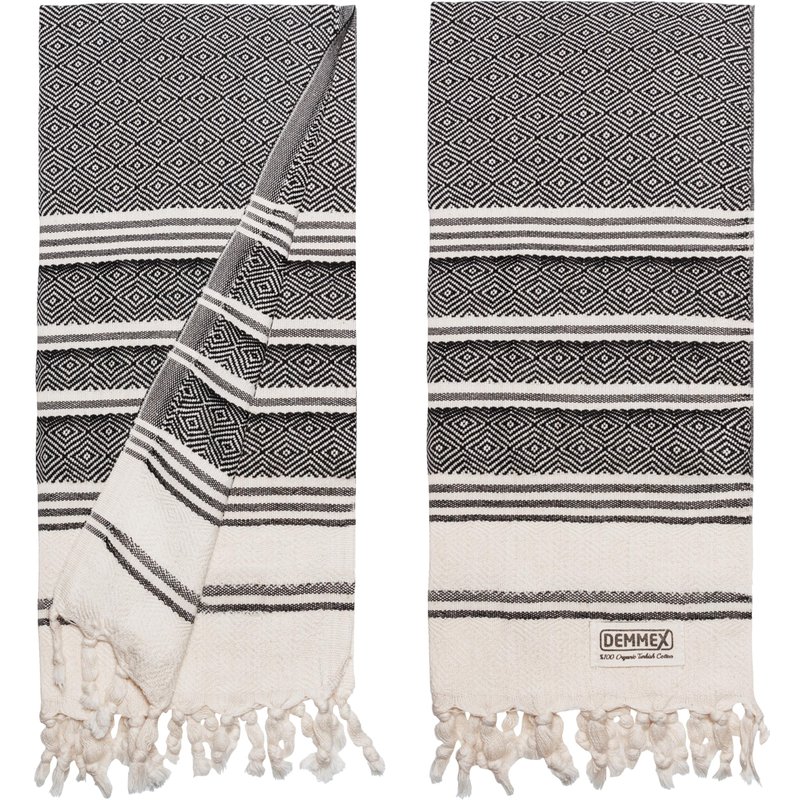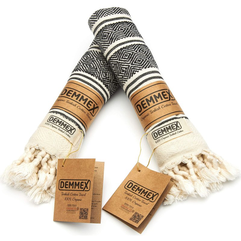 DEMMEX Certified Organic Cotton Turkish Hand Towels for Bathroom - Set of 2, Kitchen, Gym Towels - Thin Light Compact Travel Towels, Quick Dry, Diamond Weave, Prewashed, 18x36, Black