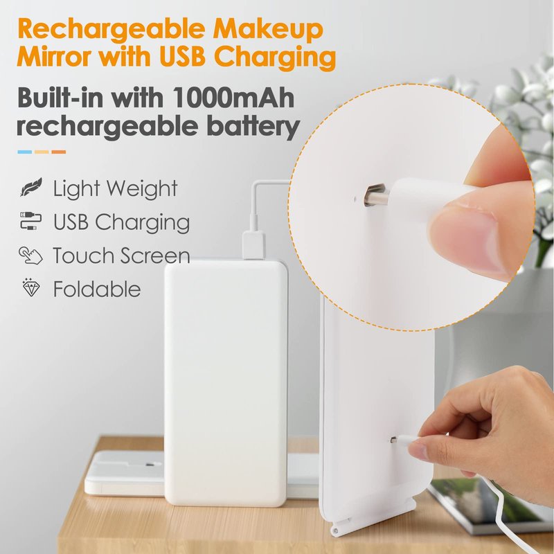 - 【USB Rechargeable】 Folding travel mirror is built-in 1000mAh rechargeable Lithium battery, no need to charge frequently or change battery any more, travel makeup mirror comes with a USB cable for charging, it can work for more than 2 hours after a full charge. Convenient for travelling.makeup mirror with lights adapt for power bank,tablet-top and so on.