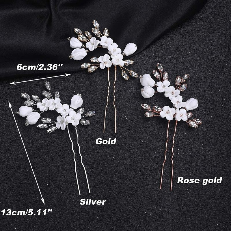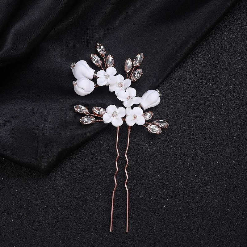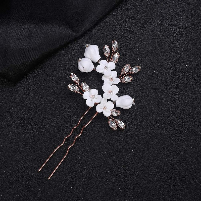 Denifery 3PCS Bride White Flower Wedding Hair Pins Clips Rhinestone Silver Bridal Hair Piece Accessories for Women and Girls (Rose Gold)