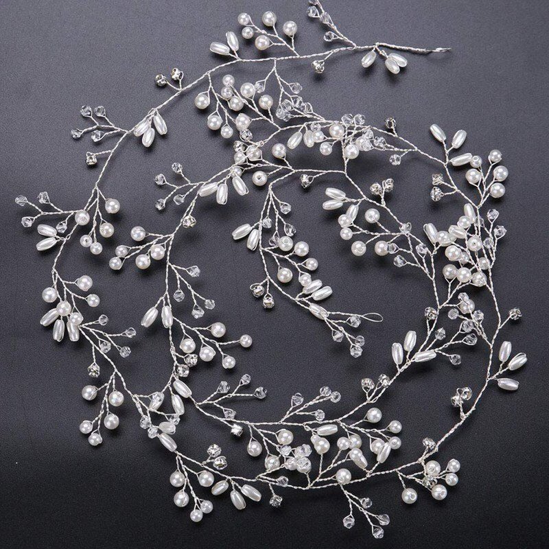 Deniferymakeup Bridal Rose Gold and Gold Silver Extra Long Pearl and Crystal Beads Bridal Hair Vine Wedding Head Piece Bridal Hair Accessories Headband Hair Jewelry Hair Accessories (Silver)