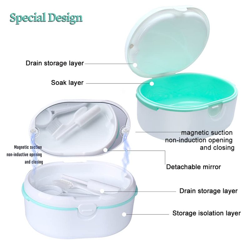 - 🟨[Special Design]-✨-The cover of this denture bath case has a built-in mirror, small and portable, you can remove makeup at any time, take out the braces, and use it anytime, anywhere. After the bottom layer is cleaned, a drain basket can be placed to filter dry, which is clean and hygienic, convenient and considerate.