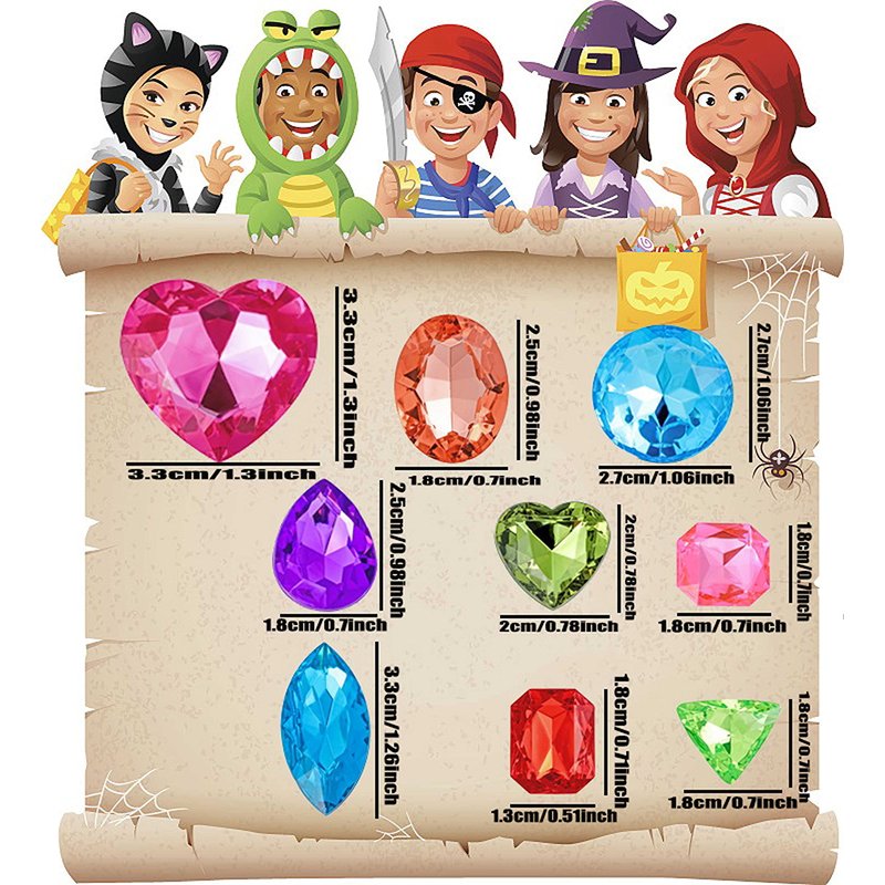 - VARIOUS SHAPES / COLORS: This pirate treasure jewels are designed in 8 different shapes: heart, round, drop, oval, square, etc. Include 10+ different colors. Perfect for party decorations, table decors, stage performance props, goody bag fillers, pirate costume ideas, treasure boxes, and prizes for kids